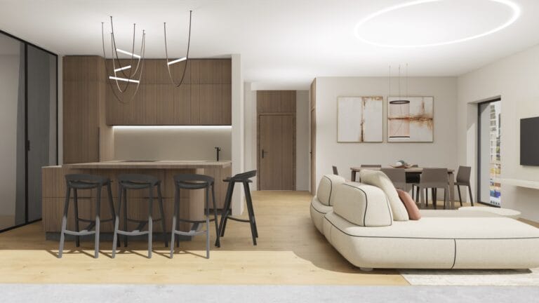 Šie namai – tai modernus interjeras, kuriame subtiliai susilieja minimalistinė estetika, švelnios spalvos ir išskirtiniai dizaino sprendimai. Interjeras alsuoja ramybe ir elegancija, tačiau išlaiko jaukumą, būtina kasdieniam gyvenimui. Natūralios medžiagos, harmoningi tonai ir šiuolaikiniai baldai kuria erdvę, kurioje kiekviena detalė