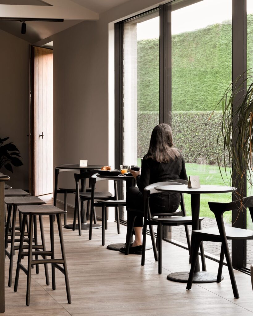 „Torsion“ valgomojo stalas – tai vizualus lengvumas ir subtilus konstrukcinis sudėtingumas. Pasitelkiant pažangiausias medžio apdirbimo technikas, sukurtas grakštus stalviršis, besiremiantis į skulptūriškos elegancijos vijuotą pagrindą. Pagamintas iš juodai beicuoto ąžuolo masyvo ir dengtas laku.